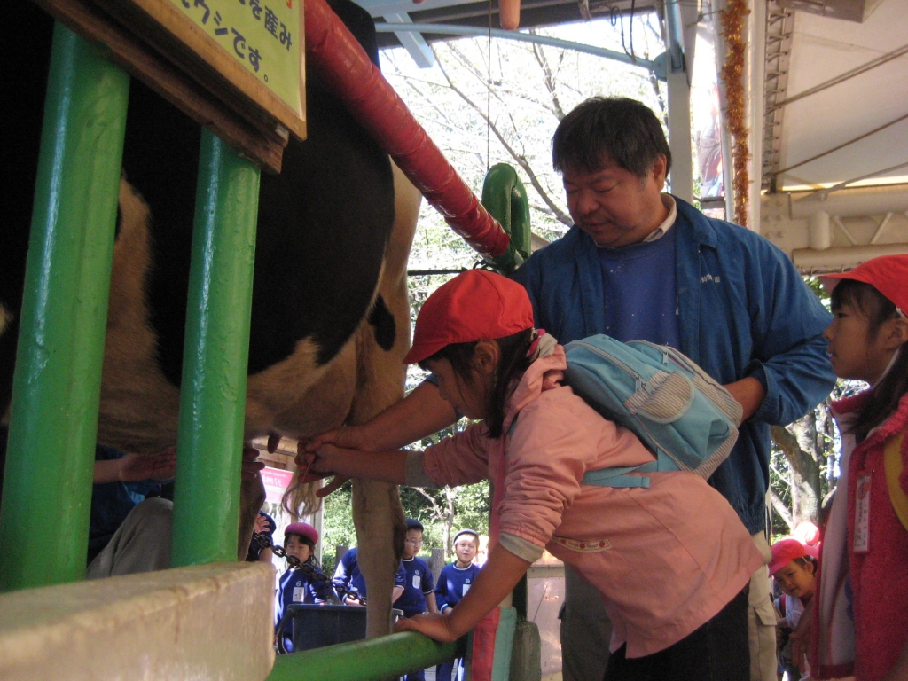 乳搾り体験では、牛の大きなおっぱいに驚き、触ってみて温かさや柔らかさに感激していました。