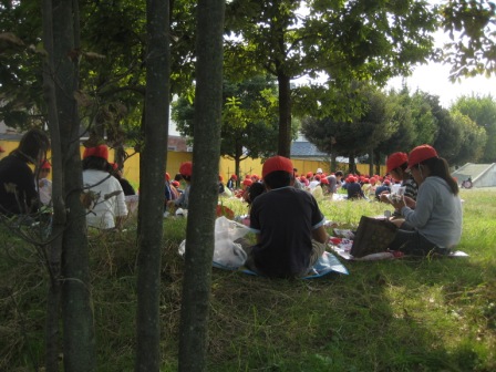 さわやかな天気に恵まれ、秋空給食を行いました。各色別チームでの屋外での会食と食後のゲームやレクを楽しみました。