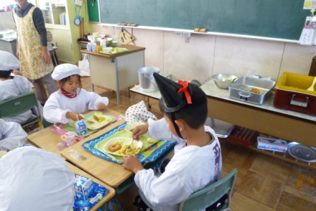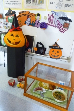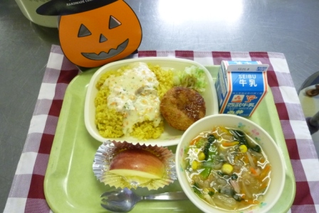 今日はハロウィンなので、かぼちゃのコロッケを給食にだしました。