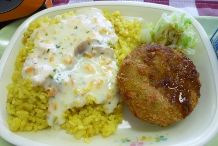 牛乳 カレーピラフドリア風 かぼちゃのコロッケ・茹でキャベツ