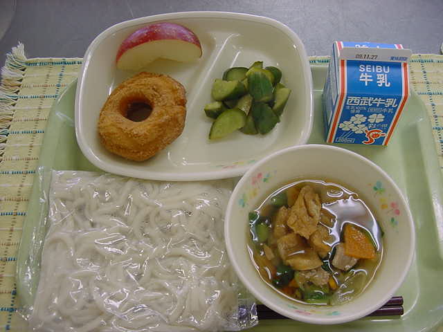 牛乳 きつねうどん 卵ドーナツ きゅうりのぴりっと漬け