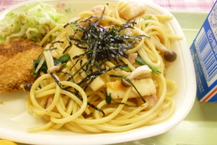 和風パスタは、刻み海苔をかけてさっぱりといただきます。
