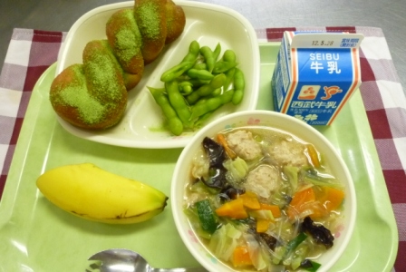 牛乳 米粉の抹茶揚げパン  枝豆 春雨と肉団子のスープ
