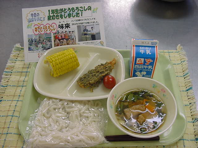 牛乳 きつねうどん 茹でとうもろこし 笹かまぼこの香味揚げ