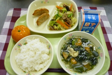 牛乳 ご飯 カリカリ餃子 回鍋肉 ワカメスープ