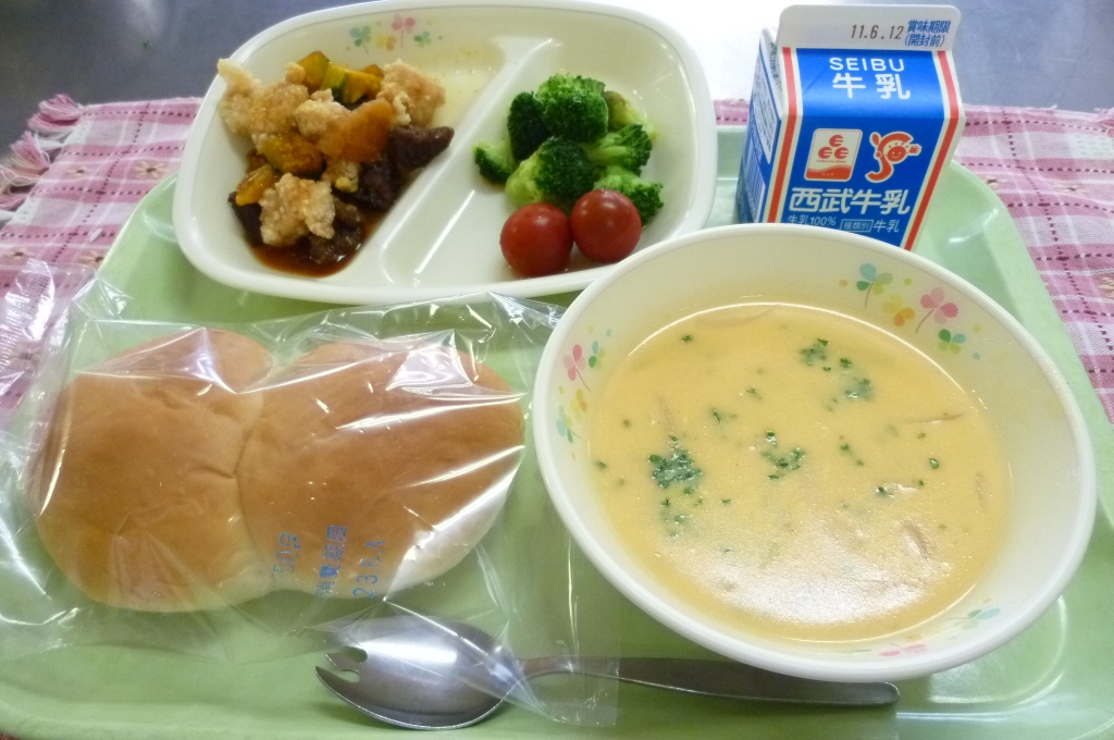 牛乳 はちみつパン 鶏肉とカボチャのオレンジソースあえ