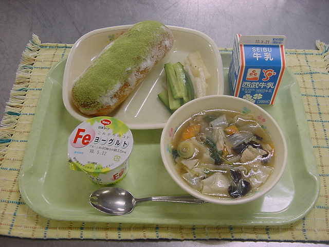 牛乳 抹茶揚げパン スティック野菜 ワンタンスープ