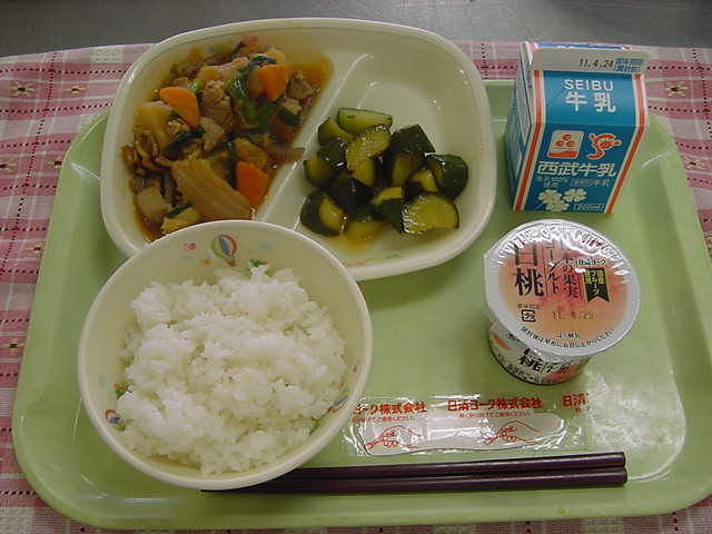 牛乳 ご飯 じゃが豚キムチ 中華きゅうり 白桃ヨーグルト