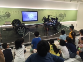 模型を使って、車が動くしくみや、事故が起きないようにする技術をくわしくして教えてもらいました。