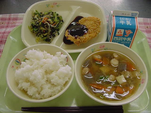 牛乳 ご飯 味噌カツ 磯の香あえ 吉野汁