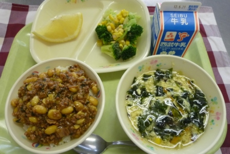 牛乳 ソイ丼 温野菜ごまドレッシング 卵スープ