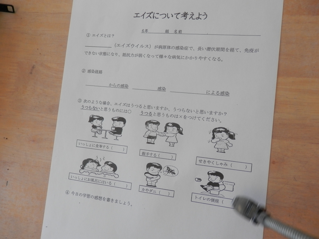 6年3組で保健学習が行われていました。養護教諭の茂木先生がゲストティチャーでした。「エイズについて考えよう」という課題でした。子供達は、真剣に学んでいました。感染性の病気について学びました。しっかりとした知識を身につけましょう。