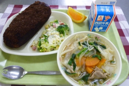 牛乳 ココア揚げパン シーザーサラダ ワンタンスープ