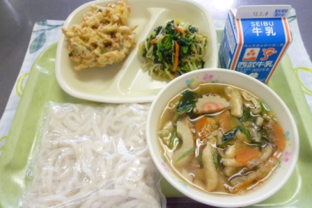 牛乳 五目うどん 手作りかき揚げ ほうれん草の胡麻酢あえ