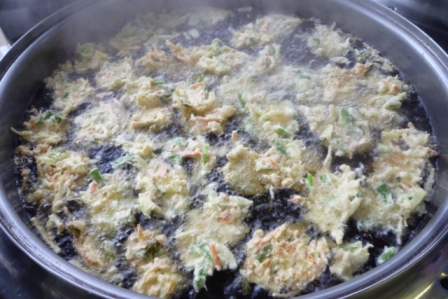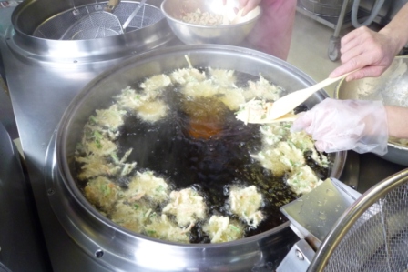 かき揚げが油の中で、踊るように・・・気持よさそうにサクサクに揚がりました!