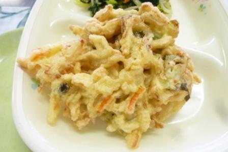 今日の『かきあげ』には、野菜類、小魚類、ゆで大豆、じゃが芋など
