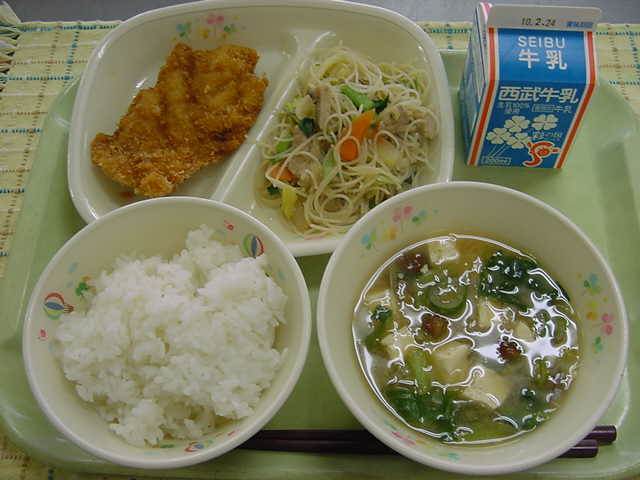 牛乳 ご飯 カツ煮 焼きビーフン なめこ汁