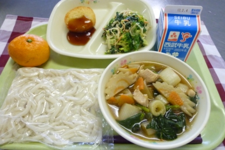 牛乳 ねぎまうどん いももち 冬野菜のごまマヨネーズあえ