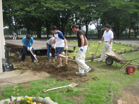 17日午前、グリープロジェクトの作業を行い、ウッドデッキに通じる歩道として枕木を並べました。夏の日差しを受けながらの作業、ありがとうございました。
