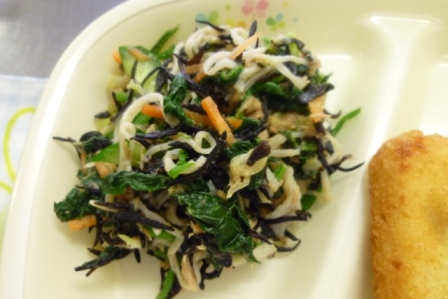 ほうれん草とひじきのサラダは先生方にも大好評! 特に校長先生に褒めて