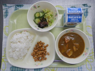 カレーライス 牛乳 大豆と小魚のカリカリ揚げ 海藻サラダ