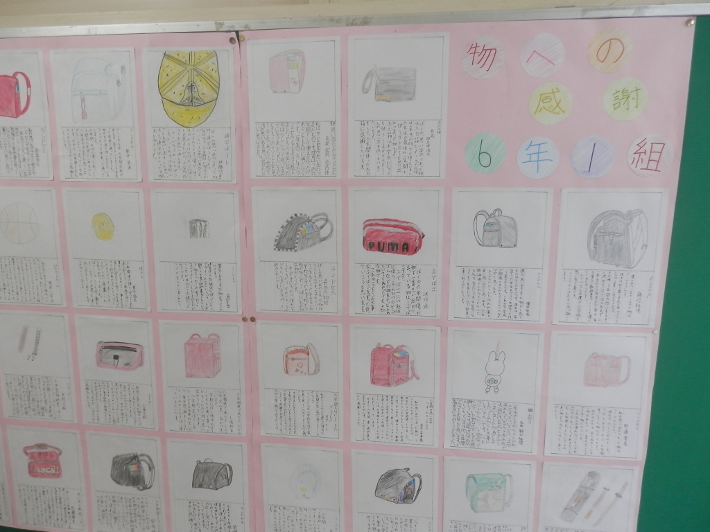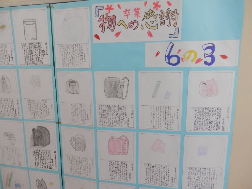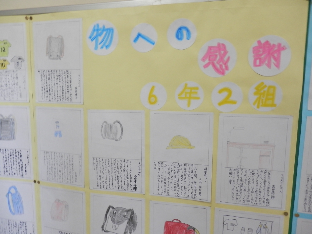 6年生が「物への感謝」で感謝の言葉を書いていました。ランドセルであったり、帽子であったりそれぞれの思いがありました。職員室の廊下に掲示してあります。感謝しつつ卒業していきます。