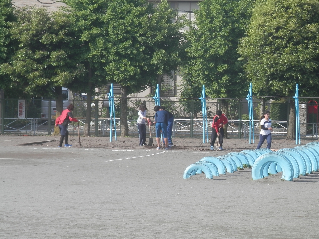 スポーツテストの練習が始まっています。体育部の先生方が朝校庭整備をしています。50M走やボール投げのライン引き、立ち幅跳びをするための砂場の整地などです。いつもありがとうございます。