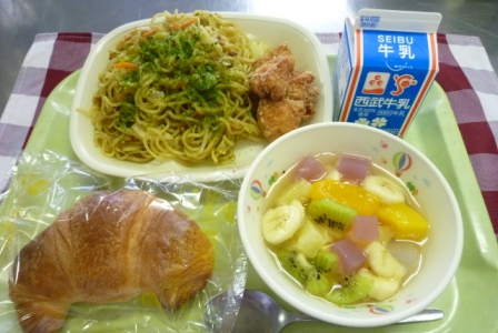 牛乳 クロワッサン ソース焼きそば 鶏のから揚げ