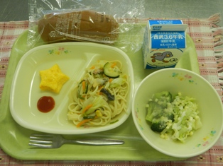 夏野菜のペペロンチーノには、ピーマン、パプリカ(赤)、ズッキーニ、ナス、コーンなどの夏野菜の他にも、たまねぎ、にんじん、キャベツなどの野菜と、エリンギ、ベーコン、あさりなどが入った具だくさんのペペロンチーノでしたが、完食!本日は、すべて完食で、調理員さんの笑顔も輝いていました!!