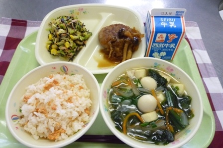 牛乳 鮭ご飯 和風ハンバーグきのこソースかけ