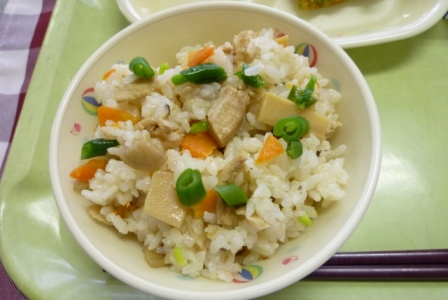 給食では酢めしに高野豆腐や干瓢、ごぼうや人参、