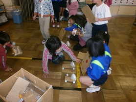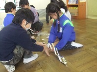 自分で楽しく作った経験を生かし、1年生に優しく遊び方を教えてあげたり、やって見せたりしていました。