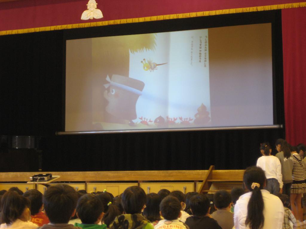 図書委員による児童集会「図書集会」を行いました。図書委員の紹介の後、お勧めの本の紹介、読み聞かせ(さるかにがっせん)、図書委員の仕事の説明がありました。スクリーンを使った説明や読み聞かせには全校が集中していました。なお、11月・12月は図書の電子化作業を行うため、図書室は閉室します。