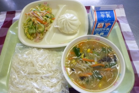 牛乳 ゴマ味噌ラーメン 肉まん 中華サラダ