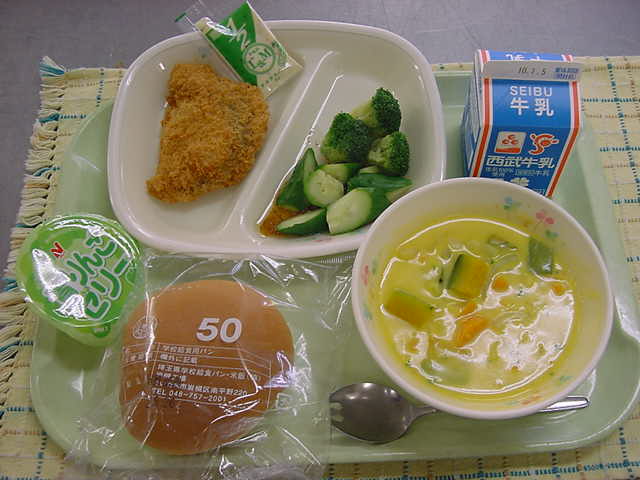 牛乳 フィッシュバーガー 温野菜 パンプキンポタージュ