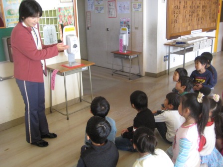 12月の生活目標の一つを「手洗い、うがいをしっかりやりましょう。」にしました。インフルエンザや感染性胃腸炎などの予防に心がけるためにも手洗い、うがいが大切です。12月1日より、登校時に手の消毒器を設置します。1年生には使い方を指導しました。