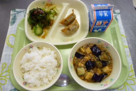 牛乳 ご飯 麻婆茄子(豆腐) カリカリ餃子