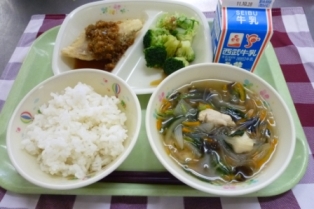 牛乳 ご飯 白身魚の南蛮漬け 温野菜 中華スープ