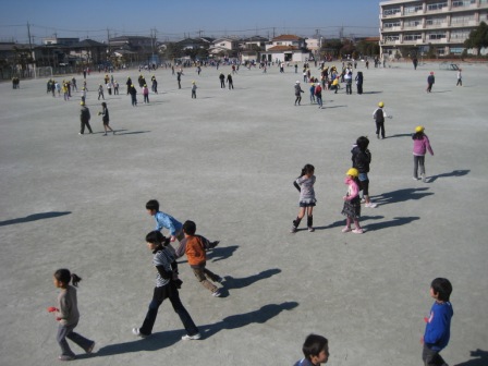 3校時と4校時の間の休み時間に「なかよしタイム」を行いました。色別のチームに分かれて、校庭いっぱいに遊ぶ子ども達は、とても元気です。