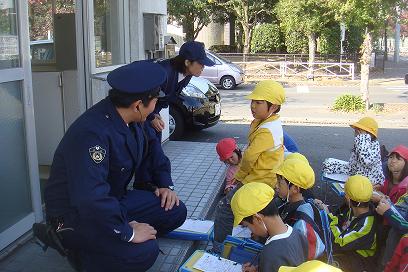 交番では、おまわりさん(警察官)が身につけているものについて見せていただいたり、おまわりさんの仕事の内容などお話を伺ったりすることができました。