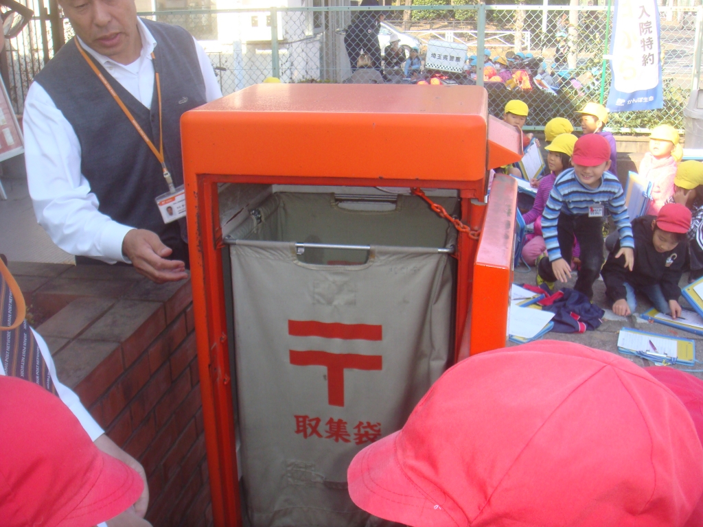 郵便局では、郵便局の3つの仕事(1郵便、2貯金、3保険)のお話を伺い、ポストの中身を見せていただきました。
