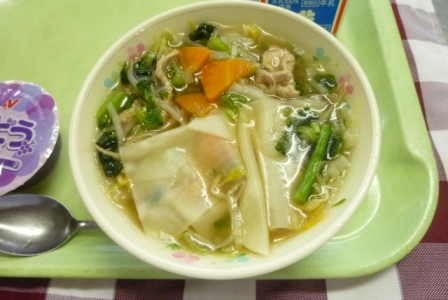 給食のワンタンスープは、皮だけのワンタンですが、