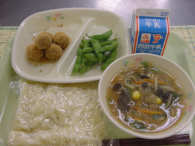 牛乳 ゴマみそラーメン 白玉団子のきな粉あえ 枝豆