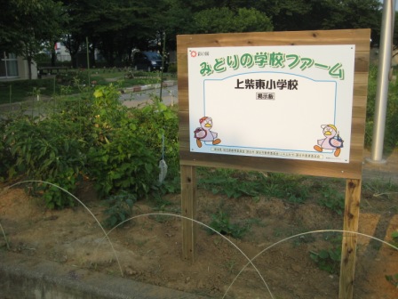 学級・学年園に「みどりの学校ファーム」の表示を設置しました。県や市などの協力をいただいた掲示板付きの表示です。現在、トウモロコシ、トマト、ナス、ネギ、サツマイモなどが作付けされ、日々育っています。