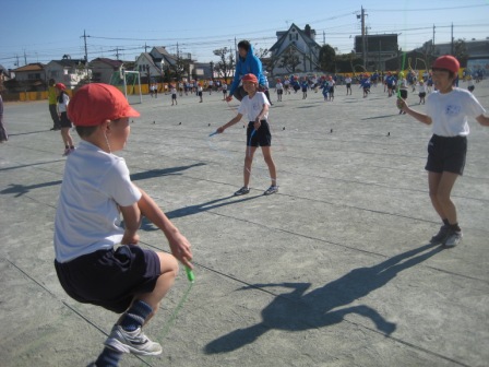 寒気の中にも日差しを受けて、元気な子ども達でさわや運動の時間には校庭いっぱいになります。子ども達は、短縄跳びで自分の回数を伸ばそうとがんばっています。