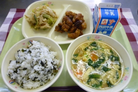 牛乳 わかめご飯 豚肉の香味揚げ ねぎぬた かきたま汁