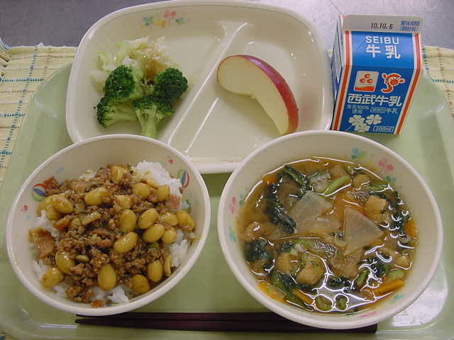 牛乳 ソイ丼 温野菜 大根とあさりの味噌汁 りんご