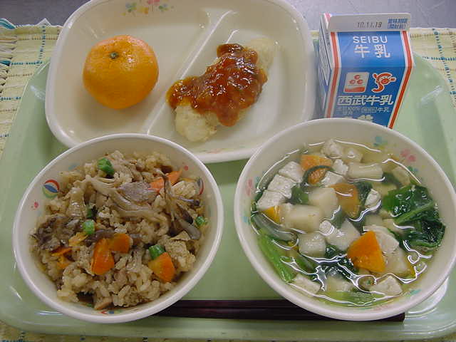 牛乳 舞茸ごはん 白身魚の甘酢あんかけ すまし汁