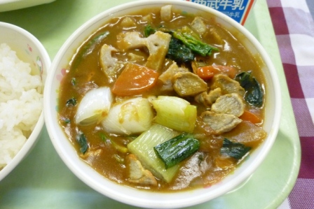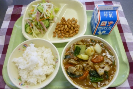 牛乳 冬野菜カレー 大豆のカリカリ揚げ ハムと大根のサラダ