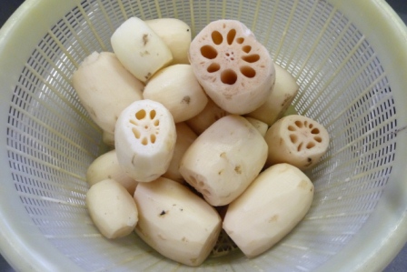 レンコンとごぼう、長ネギは素揚げし、サツマイモはジャガイモの代わり、